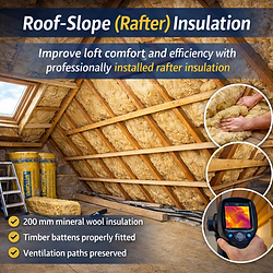 Upgrade your home with our Roof-Slope (Rafter) Insulation Service from Mr FXA Home. Designed for loft conversions or habitable roof spaces, this method improves thermal performance while maintaining airflow and protecting your roof structure. Installed to modern best-practice standards, our system helps retain heat, improve comfort, and create a more usable loft environment. 🧱 Roof-Slope (Rafter) Insulation – All Prices Include VAT: • Small loft (up to 30 m²) — £2,450 • Medium loft (30–50 m²) — £3,550 • Large loft (50–70 m²) — £4,650 • Very large loft (70–100 m²) — £6,500 What’s Included: • 200mm mineral wool insulation installed between roof rafters (subject to depth and build-up) • Timber battens fitted to retain insulation and maintain airflow • Ventilation paths preserved to roof voids • Installation carried out to modern best-practice standards • Clean, tidy completion with minimal disruption What’s Not Included: • Plasterboarding, skim finishing, or decorative finishes • Vapour control layers unless agreed in writing • Removal or alteration of existing services (electrical, plumbing, ventilation) • Structural alterations to roof timbers or rafters • Insulation to loft floors, walls, or areas not specified • Loft boarding or storage platforms • Making good beyond the immediate work area • Works required for grant or scheme accreditation EPC Assessment Support: While we are not scheme-accredited installers, EPC assessments are based on verified construction details. Where insulation is concealed, assessors typically rely on documentation and photographic evidence. On completion, Mr FXA Home provides: • A detailed invoice confirming areas insulated, insulation type, thickness (200mm), and installation date • Photographic evidence showing insulation installed and depth where possible This information is commonly accepted by EPC assessors where insulation cannot be visually inspected later. Why Choose Mr FXA Home: • Experienced, fully insured installation team • Reliable, professional service • Installed correctly to protect airflow and roof structure • Trusted by homeowners and landlords Create a warmer, more efficient loft space — book with Mr FXA Home for expert installation done right.